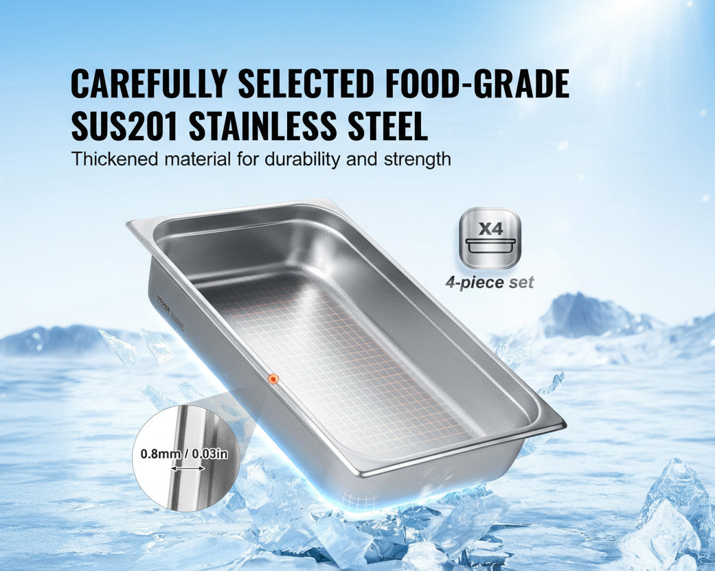 This commercial stainless steel full size steam table pan set is designed for professional food service, catering, and high-volume kitchen use. Made from durable stainless steel with a thick 0.8 mm construction, these pans resist warping while handling both hot and cold food holding. The anti-jam rib design allows for easy stacking and separation, making prep, storage, and service more efficient in busy environments.